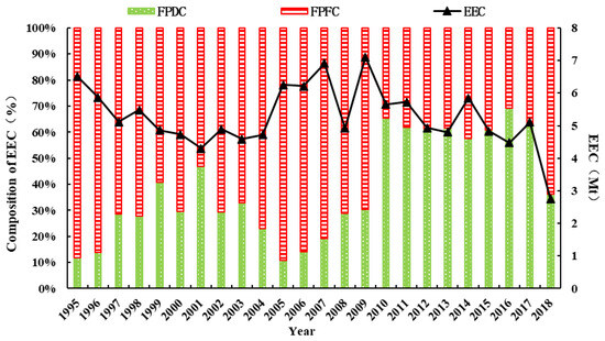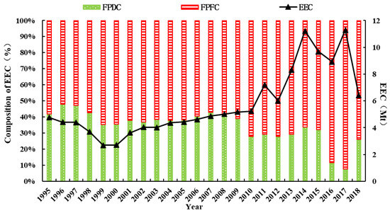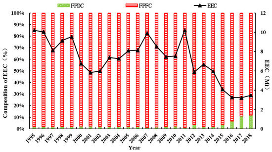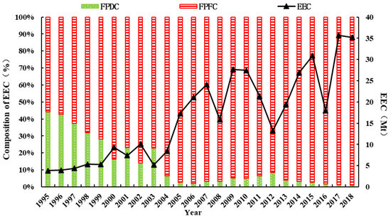 From 1995 to 2018, Brazil’s maritime transport industry generated cumulative EECs of 126.63 million tonnes, with an annual average of 5.28 million tonnes. DPDCs accounted for 37.34% of cumulative emissions, while FPDCs contributed 62.66% (see Figure 6).