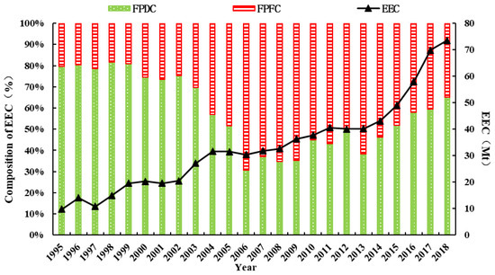 The total EECs under consumer responsibility increased by over sevenfold, from 9.85 million tonnes in 1995 to 73.56 million tonnes in 2018, confirming China’s dual role as a global supply chain hub and a major driver of consumption-driven emissions.