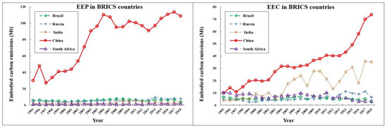 As Figure 11 shows, from 1995 to 2018, China’s EEPs in the water transport sector surged dramatically, far exceeding the levels of the other four BRICS nations. Brazil, Russia, India, and South Africa showed minimal changes in EEPs, with only minor fluctuations tied to trade volumes, and no clear upward trajectory. During the same period, China and India experienced significant rises in EECs, with China leading in growth speed and India following closely. In contrast, Brazil, Russia, and South Africa exhibited stagnant EEC trends, with Brazil even recording a slight decline. Overall, China and India drove the majority of emission growth, while the remaining three countries contributed minimally.