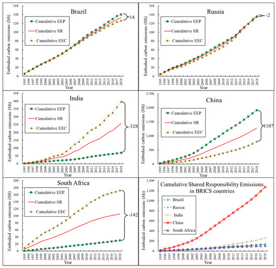 From 1995 to 2018, the carbon emission trajectories of the BRICS countries under different responsibility perspectives showed significant differences (Figure 12). Brazil, as a resource-exporting economy, had cumulative EEPs of 140.24 million tonnes, while its cumulative EECs were 126.63 million tonnes. The relatively small difference between these values reflects Brazil’s dual characteristics of being export-oriented and having import demands. In Russia, the cumulative values of EEPs and EECs were 135.36 million tonnes and 137.10 million tonnes, respectively, almost equal, indicating a dynamic balance between energy exports and import demands. In contrast, India’s carbon emission structure is quite unique: although its cumulative EEPs were only 69.80 million tonnes, its cumulative EECs reached as high as 397.40 million tonnes. China, with its vast scale, dominated with cumulative EEPs of 1910.35 million tonnes, far surpassing its cumulative EECs of 803.52 million tonnes, a difference of 1107 million tonnes, reinforcing its status as the “world’s factory”. South Africa showed the typical characteristics of a small-scale economy, with a notable difference of 142 million tonnes between its cumulative EEPs (30.74 million tonnes) and EECs (172.71 million tonnes), highlighting its heavy reliance on the transportation of imported goods.