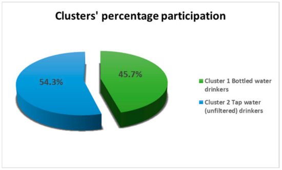 The results of the Chi-Square test with cross tabulation analysis conducted to examine the specific research objective, namely whether the distribution of drinking water consumers on the basis of their socio-demographic patterns differed between the aforementioned two consumer clusters (refer to contingency Table 1), showed that consumers’ choices of drinking water did not appear to be influenced by their socio-demographic patterns. Also, in another study regarding socio-demographic factors, no correlation was noted in relation to household drinking water quality [44]. On the other hand, other researchers indicated that particular socio-cultural elements and psychological obstacles might have been significant for a social acceptance disparity recorded between tap water and bottled options (only 50% of the individuals surveyed reported that tap water was socially accepted among family, friends and colleagues) [45].