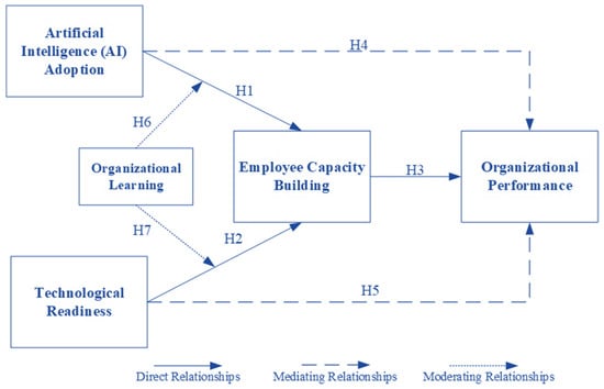 A critical enabler of the capacity building of employees is technological readiness, i.e., the degree to which an organization is equipped and prepared to adopt and put in place new technologies [31]. Technological readiness may make sure that organizational prerequisites to implement new technologies are put in place, but performance improvement comes only when the employee use these technologies effectively [60]. This is where employee capacity building comes into play, which involves the process of developing skills and knowledge to effectively use technological tools. The effect of being technologically ready on building workforce capacity, though, does not happen ipso facto but relies heavily on a solid organizational learning culture [61]. Organizational learning serves as a moderating factor in this relationship, facilitating the ongoing process of gaining new information, developing new competencies, and implementing emerging technology [62].