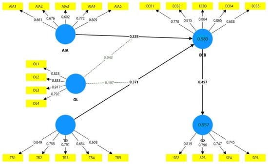 The reliability and validity results in Table 3 and Figure 2 confirm robust psychometric properties for all constructs, with item loadings > 0.60, Cronbach’s α > 0.70, composite reliability > 0.70, and AVE > 0.50, ensuring internal consistency and discriminant validity [80,81]. However, the descriptive statistics reveal high mean scores for key variables (e.g., AI adoption: 3.88–4.26; employee capacity building: 3.69–4.23), suggesting sampled export-oriented SMEs exhibit above-average technological maturity. The limited variability (SD: 0.81–1.19) likely stems from the study’s focus on export-focused firms, which often prioritize technological readiness and employee training to meet international standards. While this homogeneity underscores the sample’s alignment with global competitiveness, it may constrain generalizability to domestic SMEs with lower resource access.