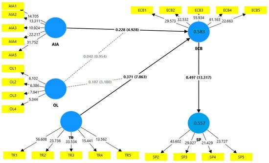In this study, we employed partial least squares structural equation modeling (PLS-SEM) for data analysis, as it is particularly suitable for studies involving complex models, smaller sample sizes, and exploratory research contexts. PLS-SEM evaluates both measurement models and structural models, enabling simultaneous assessment of construct validity and hypothesized relationships. Compared to covariance-based SEM, PLS-SEM is more robust in handling non-normal data distributions and smaller samples, making it an ideal choice for this study. This approach provided comprehensive insights into the relationships between AI adoption, technological readiness, employee capacity building, and sustainable performance [78,79]. It is possible to model both formative and reflective constructs in PLS-SEM (4.1); the software is suitable for research with small sample sizes and has no problems with multicollinearity. Also, user-friendly software and clear guidelines for the assessment of measurement and structural models enhance the application of this tool in the investigation of consumer behavior, organizational behavior, education, health psychology, and social psychology [80]. In this context, the application of the PLS-SEM approach through Smart PLS 4 is exceptionally reasonable because of the availability of numerous options for model assessment, the software’s intuitive interface, and the powerful data visualization tools that help to provide a detailed analysis and a clear interpretation of the results, thus providing a high level of research relevance and significance.