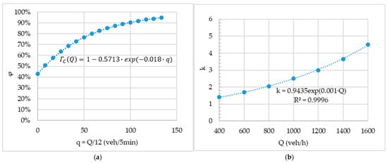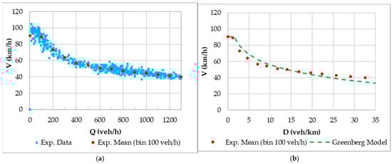 Since Q = V⋅D, the Greenberg model, expressed as , does not provide a closed-form analytical solution for due to the implicit logarithmic equation structure. However, this limitation is addressed through numerical solutions for specific Q values. D values are computed numerically for given Q values. These D values are substituted into the Greenberg equation to obtain the corresponding V values. The resulting (, ) pairs are interpolated to derive an analytical approximation of . For veh/h, the equation provides an excellent approximation of the Greenberg relationship (Figure 4a). For veh/h, the speed is assumed to be constant at 90.5 km/h, reflecting free-flow conditions.