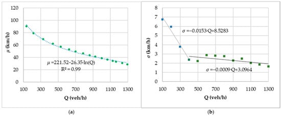 with and , which can be estimated based on real data for situations of the type under consideration (for example, as we will see in the next section, considering a macroscopic model of a Fundamental Diagram (FD) for the function describing the variation of the mean value and an interval regression model for the function of the standard deviation), to obtain a simplified yet convenient form of a stochastic (namely, Gaussian) Fundamental Diagram [1,35,36].