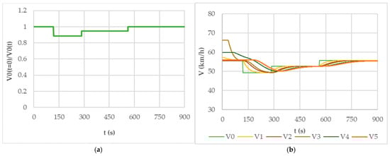 Given the homogeneity of the infrastructure downstream of the monitoring section, speed variations for the first vehicle in the simulated series were limited. Specifically, a maximum speed reduction of 20% was allowed and over 900 s of simulation, and the average speed deviation did not exceed 5% of the initial value (Figure 5a).
