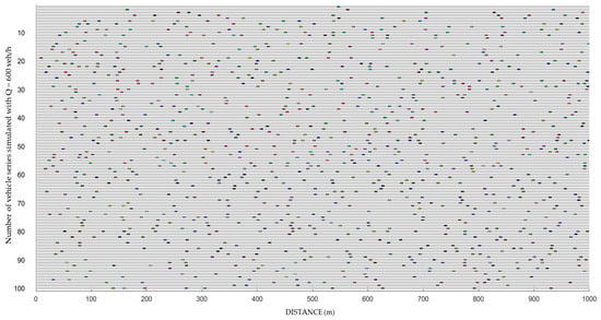 As detailed in Section 2.2, the simulation model considers hourly traffic flows between 100 veh/h and 1300 veh/h in increments of 100 veh/h. In a complete simulation session, a total of 130,000 vehicles are generated and simulated, moving along from O over an indefinite lane length. As an example, Figure 6 presents a graphical reconstruction of the results at the third simulation point, illustrating the spatial distribution of vehicles over a 1 km segment at the instant the last vehicle in the series is generated, for an average hourly traffic flow of Q = 600 veh/h.