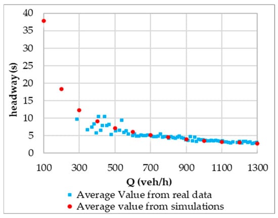 The simulated values for the temporal headways () and the speeds () were validated against real monitoring data. The validation results are presented in Figure 7 and Figure 8: Figure 7 demonstrates a strong agreement between the simulated temporal headway distribution and the empirical headway values observed in the monitoring section; Figure 8 confirms that the simulated entry speeds align well with the empirical speed distribution derived from the Greenberg model as a function of the hourly flow rate. These results confirm the accuracy and reliability of the simulation model in reproducing real-world traffic dynamics.