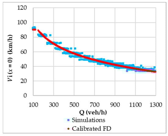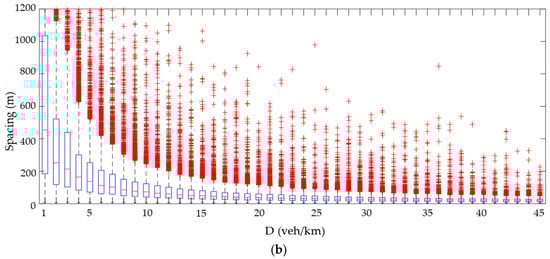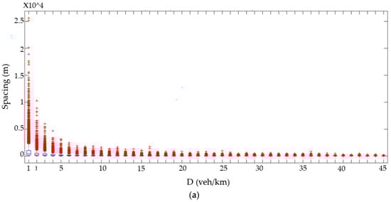 The analyzed results focus on the intervehicle spacing values for at instant , corresponding to the generation of the 100th vehicle at the origin, O. To conduct this analysis, the data were classified according to the traffic flow and density levels. Specifically, the traffic flow was considered in increments of 100 vehicles per hour, ranging from 100 to 1300 veh/h, while the density values were categorized from 1 to 45 vehicles per kilometer, with increments of 1 veh/km. The simulated flow rate was calculated by normalizing the number of vehicles passing the section between and on an hourly scale. The simulated density was obtained by normalizing the total spacing of the 100 vehicles at over a 1 km stretch of roadway.