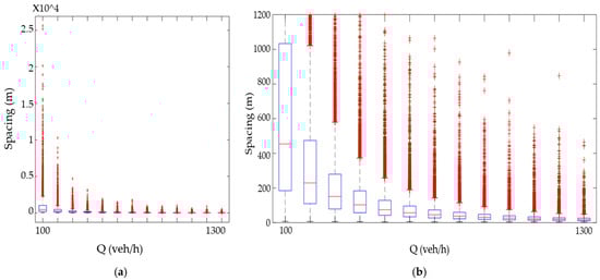 Boxplots of intervehicle spacings for groupings of simulated vehicular flow (bins of 100 veh/h): (a) the overall range of the variability of intervehicle spacings; (b) the Y-axis is limited to values of less than 1200 m for the boxplot of the entire sample.