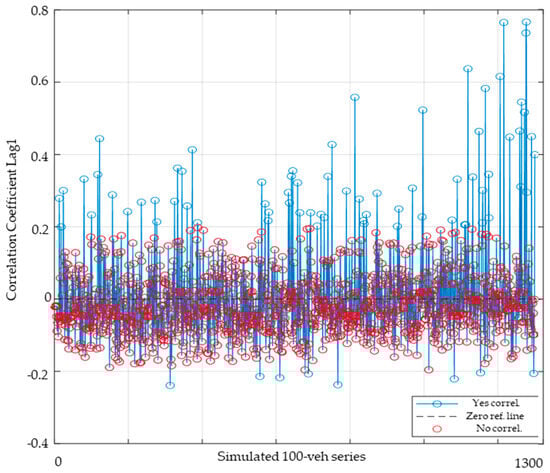 Correlation coefficient at lag 1 for 100-vehicle series simulations.