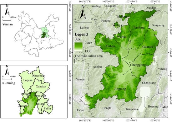 The main urban area of Kunming is located in the central part of the Yunnan-Guizhou Plateau in southwest China (102°19′ E—103°04′ E, 24°38′ N—25°46′ N). It serves as the core region of Kunming City in Yunnan Province. As China’s gateway to Southeast Asia and South Asia, the main urban area is not only the economic center of Yunnan Province but also plays a pivotal role in serving as a hub that influences the surrounding regions (Figure 1). The area includes the districts of Wuhua, Panlong, Guandu, Xishan, Chenggong, and Jinning, covering a total area of 4614 km2, which accounts for approximately 21.5% of Kunming’s total area. By the end of 2022, the total population was approximately 5.8285 million, constituting 67.8% of the city’s total population. The urbanization rate stood at 93.58%, and the GDP reached 598.62 billion yuan, representing 76.12% of the total GDP of Kunming City, thus marking it as the economic powerhouse of Yunnan Province. The main urban area is connected domestically and internationally through Kunming Changshui International Airport and Kunming South Station, supported by a dense network of railways and highways, which are crucial in facilitating transportation to the western, southern, and northeastern regions of Yunnan. The climate in Kunming is pleasant, with the smallest annual temperature variation nationwide. The vegetation primarily consists of subtropical evergreen broadleaf forests and shrublands, serving as an important ecological barrier in the region. The area is rich in biological resources, possessing significant ecological value.