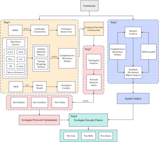 The analytical framework for the study area is divided into four parts (see Figure 2), and the specific analysis process is as follows: Step 1: Connectivity Analysis and Ecological Network Construction Based on MSPA. Initially, an MSPA is conducted to analyze the connectivity in the study area and to identify key ecological source sites. Subsequently, factors impeding ecological flow, such as land use, DEM, and slope, are selected to construct an ecological resistance surface. Using the MCR model, potential ecological corridors are delineated. By integrating ecological source sites, the resistance surface, and ecological corridors, a preliminary ecological network framework is established. Step 2: Optimization of the Ecological Network. The network is enhanced by integrating additional ecological patches, corridors, and nodes through topological analysis and network structure indices, thereby enhancing its connectivity and optimizing the spatial layout within the network to improve its stability and functionality. Step 3: Spatial Analysis. HSA and the SDE model are employed to conduct a spatial analysis, exploring the distribution of ecological resistance and the spatial characteristics of habitat quality in depth. Step 4: Construction of Ecological Security Patterns. Finally, by integrating all information from the previous steps, an ecological security pattern described as “one axis, two belts, five zones” is constructed.