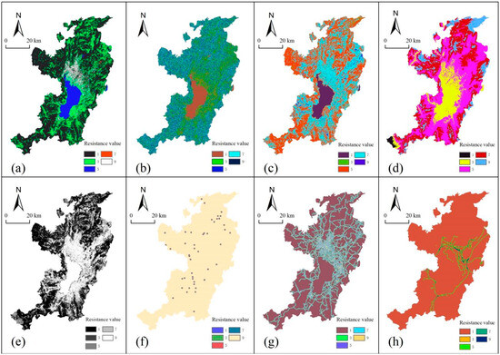 (a–d) represent the resistance values of CLCD, slope, IBI, and DEM, respectively; (e–h) represent the resistance values of FVC, distance to species distribution, distance to roads, and distance to railways, respectively.