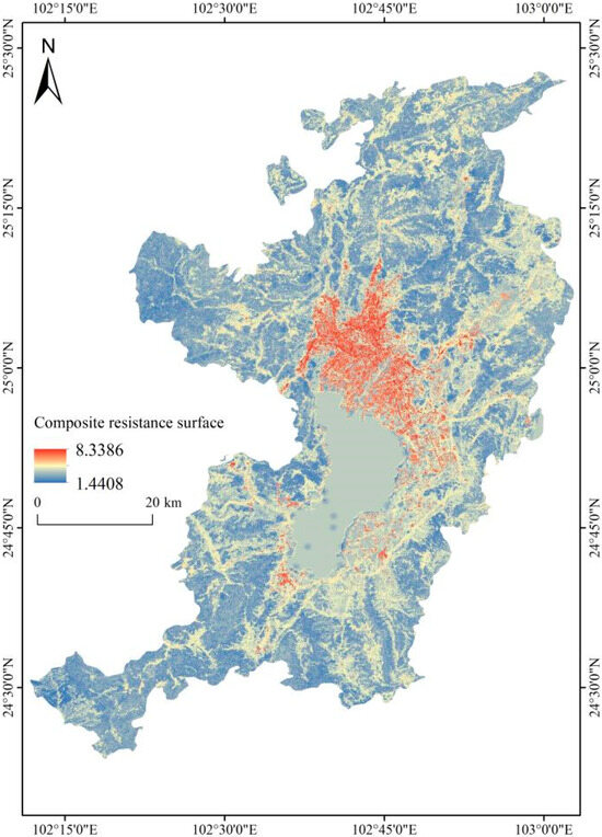 Figure 4 depicts the composite resilience surface (CRS) for the main urban area of Kunming, which is utilized to characterize the degree of resistance to ecological flows, such as wildlife migration and connectivity of ecological corridors, across different regions. Higher resistance values indicate greater human activity intensity, higher degrees of ecosystem fragmentation, and poorer ecological permeability. Areas with the highest resistance, shown in red (with a maximum resistance value of 8.33), correspond to the urban core and high-density building zones. Yellow areas, indicating medium resistance, are typically suburban or semi-developed regions. Blue areas, with the lowest resistance value of 1.44, correspond to regions with better ecological conditions, such as forests, wetlands, and nature reserves. Overall, the ecological resistance in the main urban area of Kunming decreases from the center to the periphery. Areas closer to the city center exhibit higher ecological resistance due to urbanization, whereas regions further from the center with more natural land show lower resistance, creating a pattern where the center has high resistance and the periphery has low resistance.