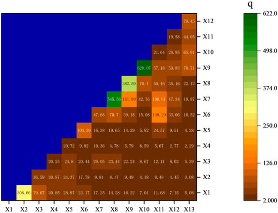 In this study, the gravity model was used to identify the intensity of interactions between ecological source areas. Figure 5 is a matrix heatmap showing the correlation or interaction between variables. The horizontal and vertical axes are labeled X1 to X13, representing 13 ecological source patches. The interaction force q ranges from 2.29 to 622.07, with green representing higher values, indicating stronger influence on the target variable, and dark brown representing lower values, indicating weaker influence and smaller contributions in the model. The higher values are mainly associated with areas related to X7, X8, X9, and X10 (for example, the interaction value between X8 and X7 is 545.56, and it is 620.07 between X9 and X10), which indicates significant ecological connectivity between source areas 8, 9, and 10. Their geographic adjacency is beneficial for the construction of ecological corridors. The lower values (brown and yellow) are concentrated in regions such as X1–X4 and X2–X5, indicating lower correlation or smaller values between these variables. Ecological source area 9 has a strong interaction, showing its central position in the regional ecological network, and should be a focus for protection and improvement of its ecological connectivity.