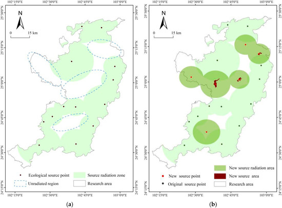 (a) shows the radiation range of ecological source areas in the study area and the non-radiated areas. (b) Newly added ecological patches in the study area.