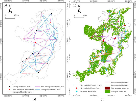 (a) shows the spatial distribution of newly added ecological corridors, (b) shows the ecological patches in the study area.