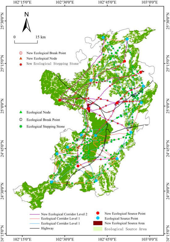 New ecological nodes, stepping stones, and breakpoints in the study area.
