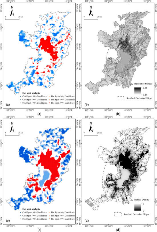 Utilizing data on ecological resistance and habitat quality, this study employed HSA and SDE to determine the spatial characteristics of ecological resistance and habitat quality within the designated research area. The habitat quality module of the InVEST model was utilized to calculate the habitat quality of the main urban area of Kunming. The initial step involved the creation of a grid in ArcGIS, dividing the entire main urban area into 500 m × 500 m sections, followed by a spatial statistical analysis of the average resistance values per grid. As depicted in Figure 9a, the spatial hotspots of resistance in Kunming’s urban core (Gi* values exceeding 1.645 at 90%, 1.960 at 95%, or 2.576 at 99%) predominantly exhibit a planar distribution, concentrating in built-up areas, particularly in Wuhua District, Panlong District, and Xishan District. These regions, characterized by their fragile ecological environments and high resistance values, significantly impede ecological processes. Conversely, cold spot areas (Gi* values less than −1.645 at 90%, −1.960 at 95%, or −2.576 at 99%) are primarily located in the northern, western, and southern forested areas of the study region, signifying lower ecological resistance and healthier ecological environments.