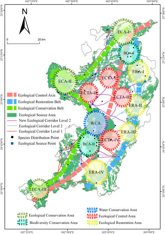 In the process of constructing ecological security patterns, this study proposes enhancing the ecological network connectivity and stability in the main urban area of Kunming through the optimization of ecological corridors, selection of key ecological nodes, and integration of ecological functional zones. The core content of building ecological security patterns primarily encompasses the following three aspects: