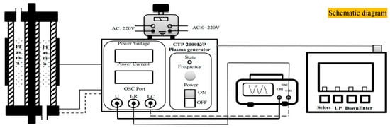 In this study, PAW was generated using a coaxial dual dielectric barrier discharge (DBD) reactor powered by a pulsed alternating current (AC) high-voltage power supply. Subsequently, the coal samples were treated with PAW, and the relevant experiments were conducted. The PAW generation system shown in Figure 3 is based on a coaxial DBD reactor driven by a pulsed AC high-voltage power source. The three main subsystems of the equipment are the electrical diagnostic system, the coaxial dual dielectric barrier PAW treatment system, and the high-voltage power supply system. The output voltage of the experimental power supply ranged from 0 to 30 kV. The frequency of the sine wave was 8–20 kHz. The sine wave was modulated using a pulse controller. The output voltage of the voltage regulator is AC 0–250 V. The adjustable frequency range of the pulse controller is 1–1000 Hz, and the adjustable pulse duty cycle range is 1–99%.