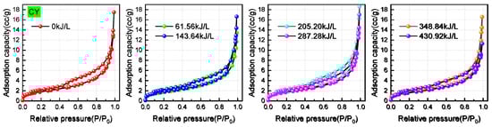 The low-pressure N2 (77 K) adsorption isotherms of five coal samples with five levels of metamorphism (CY, QM, JM, PM, and PS) after seven PAW treatments with ionization intensities of 0 kJ/L, 61.56 kJ/L, 143.64 kJ/L, 205.20 kJ/L, 287.28 kJ/L, 348.84 kJ/L, and 430.92 kJ/L are shown in Figure 19. The adsorption isotherms of the coal samples and the IUPAC classification criteria reveal that the adsorption isotherms of coal could be regarded as class IV(a) [37]. After the PAW treatment, the N2 adsorption of the coal samples varied dramatically. This indirectly indicated that PAW altered the pore structure properties of coal dust. The next section presents a quantitative analysis of the impact of PAW on the specific surface area, pore size, and pore volume of coal dust.
