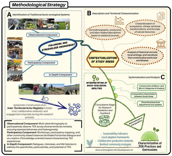 This research adopted an exploratory, multi-sited, and predominantly qualitative methodological strategy, structured into three main stages (Figure 1), aimed at characterizing and interrelating various TEK expressions in four areas representative of Chile’s ecosystemic and socio-cultural diversity. The inherent complexity of TEK systems [32], their intricate relationship with territory, and community dynamics required an adaptive research strategy capable of capturing the specificities and nuances of this knowledge in particular local contexts [118,119].