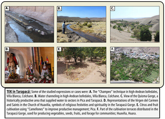 In Tarapacá, TEK expressions represent a remarkable model of sustainability in one of the world’s most arid ecosystems (Figure 3). The practices developed, maintained, and transmitted by peoples (Aymara, Quechua, and Diaguita, among others present in the area) reflect centuries of adaptation to their environment, practicing efficient and sustainable natural resource management [100]. Traditional productive systems in the region are deeply integrated with the landscape, combining agricultural, pastoral, and water-related practices with cultural and spiritual expressions that reinforce social cohesion.