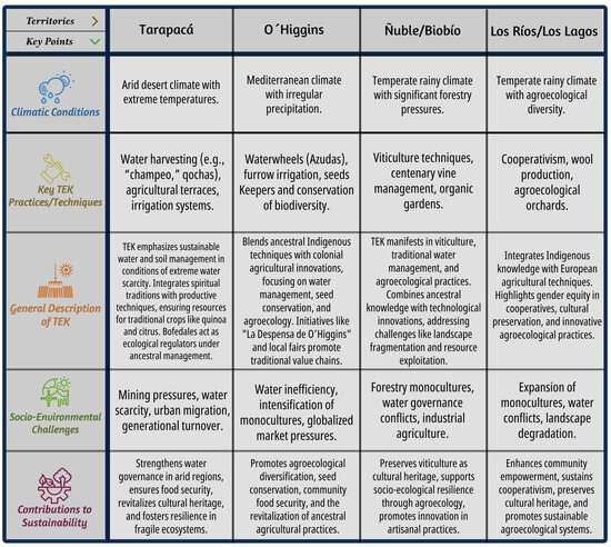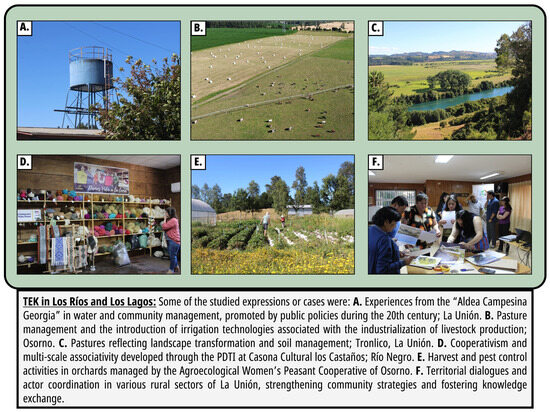 The Los Ríos and Los Lagos regions—administratively separated in 2007—present a singular TEK tapestry (Figure 6), shaped by the interaction between ancestral knowledge of Indigenous peoples (Mapuche, Huilliche, and Lafkenche) and the technical–productive legacy introduced by European colonizers in the early 20th century. These dynamics have given rise to a syncretism between what is ancestral and what is modern, despite contemporary socio-economic and environmental transformations.