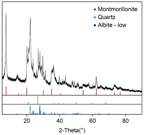 The bentonite used in this study is sodium-based bentonite, with montmorillonite, quartz, and low albite as its primary mineral components, as identified by X-ray diffraction (XRD) analysis, as shown in Figure 1. The chemical compositions of bentonite were determined using X-ray fluorescence (XRF) spectroscopy, showing major constituents of SiO2 (65.746%), Al2O3 (15.203%), Na2O (3.424%), MgO (3.174%), and CaO (6.778%) (Table 1). As shown in Figure 2, the particle size distribution was analyzed using a Malvern laser particle size analyzer, with a median particle size d(5%) of 9.183 μm, d(10%) of 3.726 μm, and d(90%) of 28.558 μm. The specific surface area of bentonite is 1.19 m2/g. Additionally, the swelling volume of bentonite is 54 mL/g, determined according to GB/T 20973-2020 Bentonite [54].
