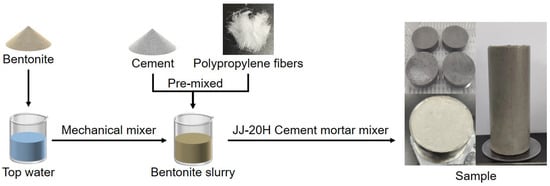 The preparation process of the cement–bentonite samples is illustrated in Figure 3. The preparation steps are as follows: First, 1 L of tap water was measured and poured into a 2 L beaker. The pre-weighed bentonite was then gradually added to the beaker and continuously stirred with a mechanical mixer until no visible clumps remained. The bentonite slurry was then sealed with plastic wrap and left to stand at 20 °C for 24 h to ensure full water absorption and swelling, improving its dispersion. Meanwhile, the pre-weighed polypropylene fibers and cement were dry-mixed under controlled conditions to ensure uniform fiber distribution and prevent fiber agglomeration. Next, the hydrated bentonite slurry was gradually poured into the pre-mixed cement and polypropylene fiber mixture, while pre-stirred with a mixing rod to achieve initial uniformity. The mixture was then subjected to a two-stage mechanical mixing process using a JJ-20H cement mortar mixer. A low-speed mixing phase was conducted for 1 min with a blade rotation speed of 140 ± 5 rpm and a planetary speed of 62 ± 5 rpm. It was followed by a high-speed mixing phase for 5 min, during which the blade rotated at 285 ± 10 rpm and the planetary motion operated at 125 ± 10 rpm. Visual observation throughout the mixing confirmed uniform dispersion of fibers and the absence of visible agglomerates. This procedure was consistently applied across all specimens to ensure reproducibility. After mixing, the slurry was immediately poured into standard molds (unconfined compressive strength test: φ40 × 100 mm; direct shear test: φ61.8 × 20 mm; falling head permeability test: φ61.8 × 40 mm), with the exposed surfaces covered with plastic wrap to prevent moisture loss. After 24–48 h, once the samples had solidified, the plastic wrap was removed. The specimens were placed in a curing chamber and then maintained at 20 ± 2 °C and relative humidity of above 95% for 7, 14, and 28 d.