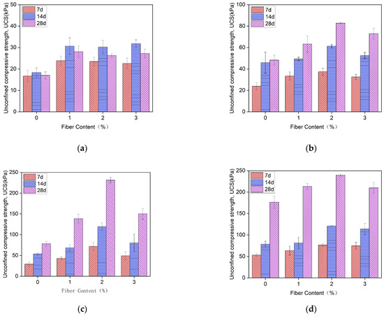 Unconfined compressive strength (UCS) test results for different sample groups after 7, 14, and 28 days. (a) Group A; (b) Group B; (c) Group C; (d) Group D.