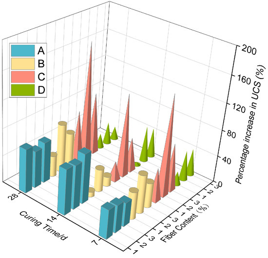 The increase in UCS percentage (Figure 5) clearly showed the strengthening influence of fiber addition under different conditions. Group C (cement dosage of 150 kg/m3) with 2% fiber content exhibited the most significant improvement, with UCS increases of 147.95%, 122.22%, and 194.92% after 7, 14, and 28 days, respectively. The result suggested that a moderate cement content ensures sufficient hydration product formation while preserving bentonite’s swelling capacity, thus optimizing the reinforcing effects of fiber.
