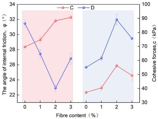 The shear strength test results are shown in Figure 6. In the D-group (200 kg/m3 cement + 0~3% fiber) samples, cohesion increased from approximately 55 kPa (0% fiber) to 90 kPa (2% fiber), followed by a slight decrease at 3% fiber content. A similar trend was observed in the C-group samples, although the overall cohesion was lower, with a peak value of approximately 60 kPa. The result suggested that moderate fiber content enhanced the bonding between the matrix and soil particles via the bridging effects, improving shear strength. However, when fiber content exceeded 2%, fiber agglomeration might lead to matrix heterogeneity, causing a slight reduction in cohesion.