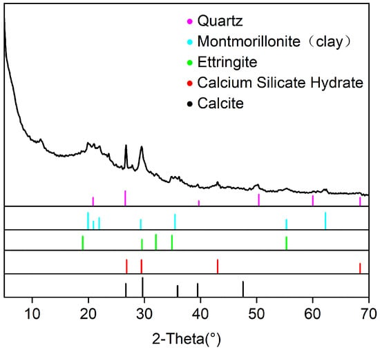 XRD analysis indicated that the representative sample C-1 (150 kg/m3 cement + 0% fiber) (Figure 8) was composed of quartz, montmorillonite, ettringite (AFt), calcium silicate hydrate (C–S–H), and calcite.