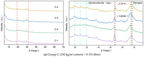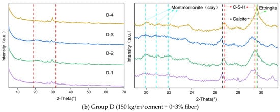 Figure 9 presents the XRD patterns of Group C (150 kg/m3 cement + 0~3% fiber) and D (150 kg/m3 cement + 0~3% fiber) specimens. In the cement–bentonite system, the main hydration products—C–S–H, AFt, and calcite—showed strong peak under optimal fiber conditions. C–S–H appeared as broad peaks near 26.8° and 29.5° (2θ). Ettringite appeared as a sharp peak around 29.6°. Calcite appeared as distinct peaks at 26.7° and 29.7°. With the addition of polypropylene fiber, particularly at 2% content, the intensities of these peaks significantly increased, indicating that fiber promoted cement hydration by retaining internal moisture, facilitating ion transport, and providing nucleation sites. The most prominent hydration product peaks were observed in C-3 (150 kg/m3 cement + 2% fiber) and D-3 (200 kg/m3 cement + 2% fiber) samples, suggesting that this fiber dosage optimized the hydration environment. In contrast, a slight decrease in peak intensity at 3% fiber content might result from fiber agglomeration and disruption of the internal matrix continuity. The concurrent enhancement of C–S–H (providing strength), ettringite (early-stage filler), and calcite (secondary carbonation product) demonstrated that fiber not only improved early hydration but also supported secondary mineral formation, contributing to matrix densification and long-term structural stability.