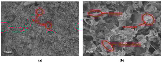 Figure 10b,d,f,h show clear distinctions in microstructural composition and morphology. Group C (Figure 10b,d) contained abundant montmorillonite clay particles characterized by layered, sheet-like stacking structures. On the other hand, Group D (Figure 10f,h) presented numerous needle-like ettringite crystals and dense interwoven networks, which were significantly more abundant, compared to Group C.