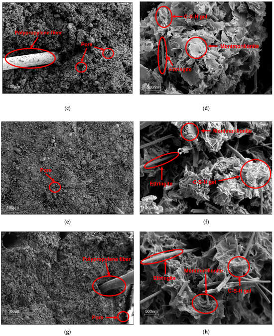 It was observed that samples with fiber incorporation (Figure 10d,h) displayed a notably higher quantity of needle-like ettringite crystals. The result indicated that polypropylene fiber incorporation enhanced cement hydration, facilitating nucleation and growth of ettringite crystals, leading to a more uniform distribution within the material. Such microstructural changes effectively the filled internal void spaces and optimized the pore distribution, which enhanced the compactness and strength of the cut-off materials. These findings coincided with the permeability test results.