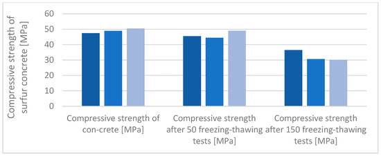 The results of the frost resistance test are summarised in Figure 4 and Table 7 and Table 8. The polymer–sulphur concrete obtained a rating of F50, but did not achieve F150 (the reduction in strength is greater than the 20% allowed). For frost resistance, an F50 degree corresponds to only 17 years of use at the customer’s request, whereas F150 corresponds to 50 years of use according to the requirements of PN-EN 206 and guidelines for transport facilities.