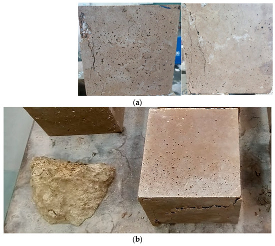 As shown in Figure 4, the concrete samples cracked after 150 cycles of frost resistance testing. Sulphur concrete is a type of polymer concrete, so there was less peeling after the durability tests. Therefore, the weight reduction that was obtained is not a typical quantity seen in determining the frost resistance of concrete. In addition, due to the very low absorbability of this type of concrete, the measurement of its changes in volume could be unreliable. In this case, the concrete should be evaluated based on the change in mechanical properties. For this reason, a study showing its weight reduction after the freeze–thaw cycles was conducted.