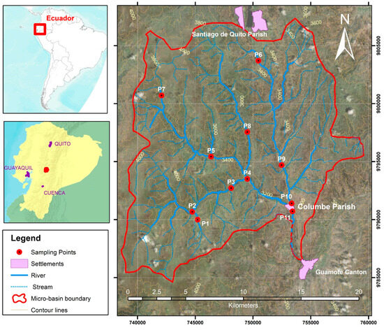 The present study was conducted in the Columbe River micro-watershed, which covers an area of 309.13 km2 and is located in the Columbe parish, Colta canton, Chimborazo province. It features a characteristic Ecuadorian Andean climate, with an average annual temperature of 11 °C [22]. Its altitudinal range spans from 3080 to 4320 m above sea level, contributing to remarkable microclimatic and ecological diversity [23]. Annual precipitation varies significantly, with minimum values of 500 mm, maximum values of 1250 mm, and an average of 780 mm [23]. The soil taxonomy in the Columbe parish is classified into Inceptisols (44%), Mollisols (30%), Entisols (25%), and Histosols (1%), reflecting significant edaphic heterogeneity [22]. Regarding land use and cover, agricultural areas dominate, occupying 62.23% of the territory, followed by shrub and herbaceous vegetation (34.73%), desertified areas (2.82%), anthropogenic zones (0.17%), and water bodies (0.04%) [22,23]. The ecosystems include Evergreen Montane Shrubland of the Northern Andes, Evergreen Shrubland and Grassland of the Páramo, Páramo Grassland, Subnival Evergreen Grassland and Shrubland of the Páramo, and Intervention Zones, reflecting the climatic and altitudinal conditions of the micro-watershed [22,23]. The micro-watershed consists of páramo-origin tributaries, including the Guashi River, Sasapud River, Guahuijón River, Llinllín Creek, Pulucate Creek, Llinllín River, and several secondary drainages [24].