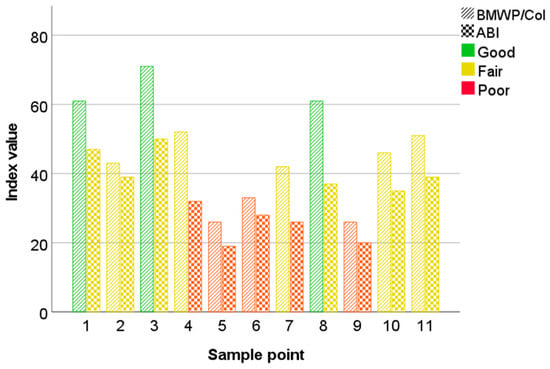 The BMWP-Col recorded high values, indicating fair-to-good water quality at points 1, 2, 3, 4, 7, 8, 10, and 11, with point 3 showing the highest value (71). Low values, reflecting poor water quality, were observed at points 5, 6, and 9, with point 9 being the lowest (26). The ABI showed a similar trend, with high values (fair water quality) at points 1, 2, 3, 8, 10, and 11. Point 3 again recorded the highest value (50). Poor water quality was evident at points 4, 5, 6, 7, and 9, with point 5 showing the lowest value (19), closely followed by point 9 (20).