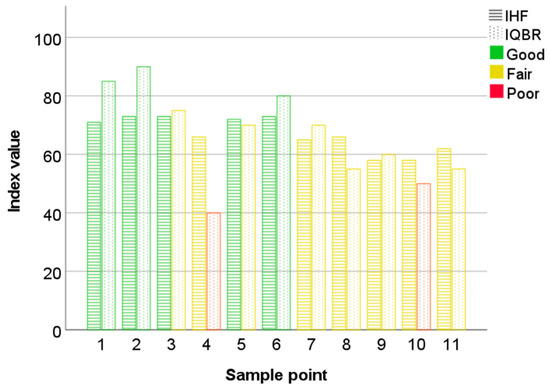 The Fluvial Habitat Index (IHF) classified habitat quality as “good” at points 1, 2, 3, 5, and 6, with the highest values recorded at points 2, 3, and 6 (73). Habitat quality was “fair” at points 4, 7, 8, 9, 10, and 11, with the lowest values observed at points 9 and 10 (58).