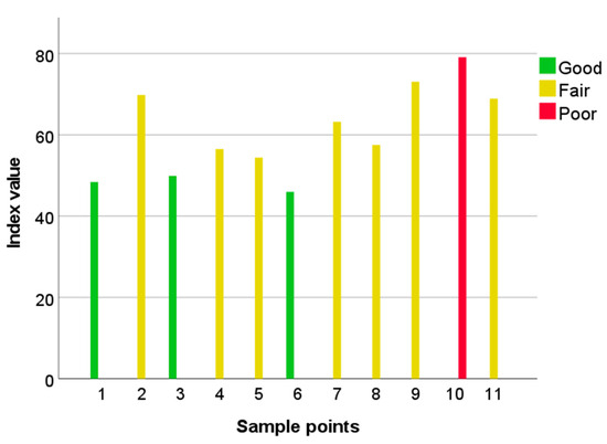 Figure 2 shows the total index values calculated for each sampling point using the scores from Table 6 and Table 7.