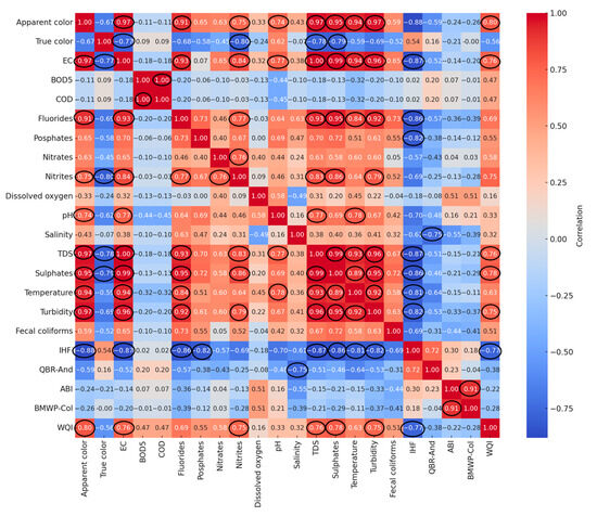 The Pearson correlation coefficient was calculated to identify significant relationships (p < 0.01) between the water quality parameters and the ecological indices.
