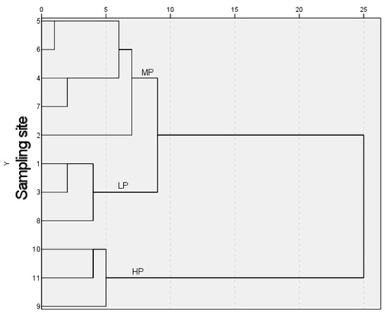 To explore spatial patterns, a hierarchical agglomerative cluster analysis (CA) was performed using the Ward linkage method and Euclidean distance applied to standardized values (Z-scores) of 22 variables: 17 physicochemical parameters and 5 ecological indices. Standardization was necessary to homogenize variable scales and ensure comparability across different units of measurement. This clustering method was selected due to its demonstrated ability to produce compact and interpretable groupings, which is particularly advantageous in environmental assessments [40,41]. To validate the robustness of the clustering solution, a sensitivity analysis was carried out by comparing results across alternative linkage methods (single, complete, average) and distance metrics (cityblock and correlation). Furthermore, the agglomeration coefficient schedule was reviewed to determine the optimal number of clusters. A marked increase in the coefficient value between successive fusion stages was used as the criterion for selecting the cut-off point, thereby avoiding reliance solely on visual inspection of the dendrogram.