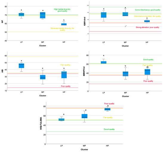 - Álvarez-Cabria, M.; Barquín, J.; Juanes, J.A. Spatial and seasonal variability of macroinvertebrate metrics: Do macroinvertebrate communities track river health? Ecol. Indic. 2010, 10, 2. [Google Scholar] [CrossRef]