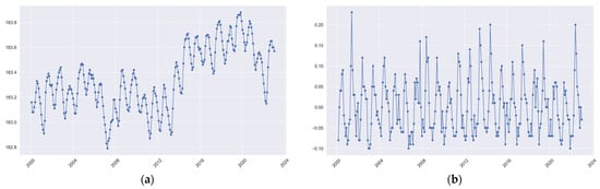 The assumption of a stationary non-white noise sequence means that the statistical characteristics of the water level change do not change significantly over time, and there is a certain correlation between the various observed values in the sequence, rather than there being completely random white noise. To verify this assumption, take Lake Superior as an example. The water level change from January 2000 to December 2022 is shown in Figure 3a, and it can be seen that it shows an annual cycle change. After first-order differencing, it is shown in Figure 3b.